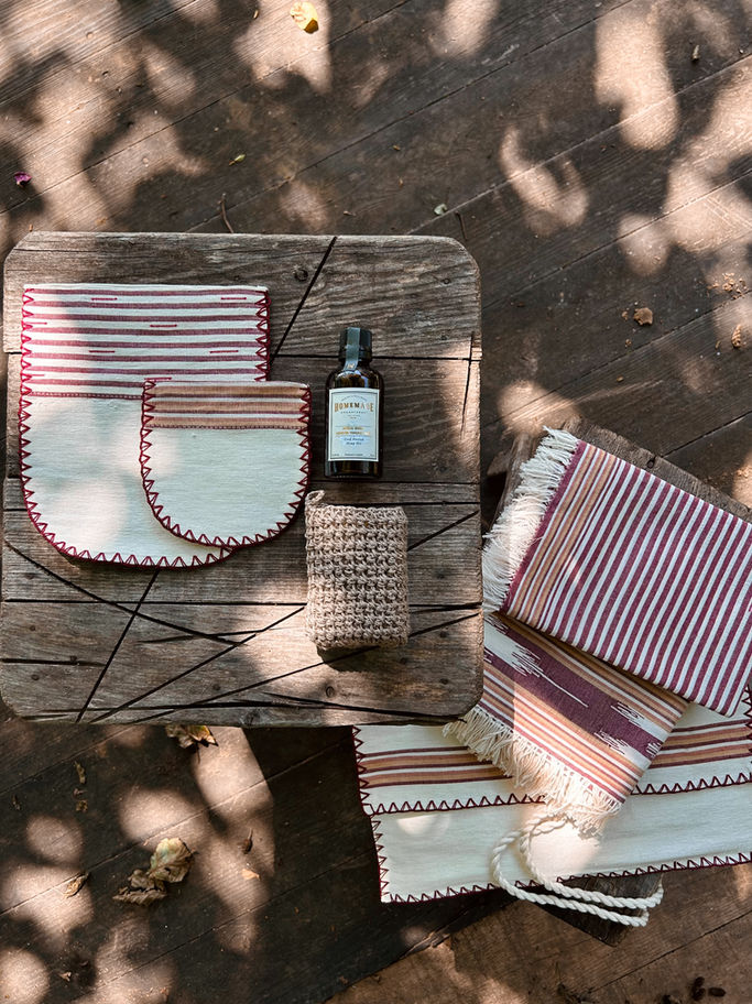 Kenevir Hamam Seti, Karadenizli kadınlar tarafından, geleneksel kara tezgahlarda dokunan feretiko kumaşından üretildi.